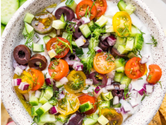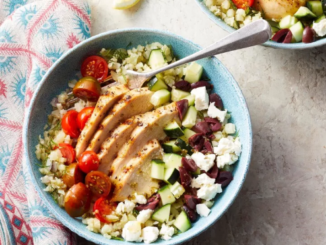 These healthy Greek-inspired cauliflower rice bowls topped with feta, olives, veggies and grilled chicken are
