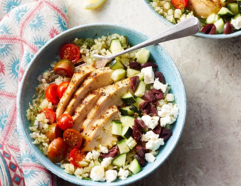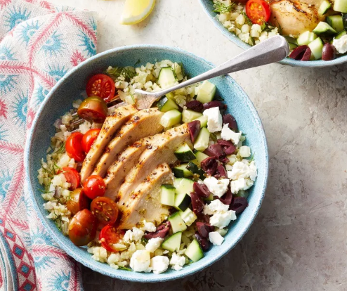 - Divide the cauliflower rice between 4 bowls. Top with the chicken, tomatoes, cucumber, olives and feta. Sprinkle with remaining 1/4 cup dill. Drizzle with the vinaigrette. Serve with lemon wedges, if desired.