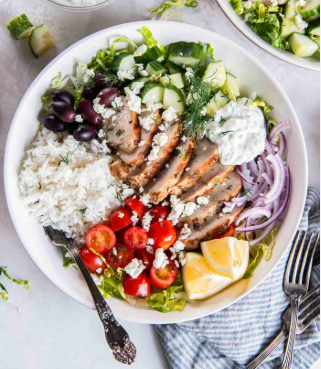 - Assemble the rice bowls and divide the ingredients into four servings. Start with a base of cooked rice. Next, add the chicken chickpeas, cucumber, tomatoes, and red onion. Lastly add the hummus, tzatziki, and feta cheese. You can also add an extra drizzle of Greek dressing if you would like.