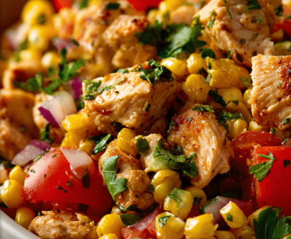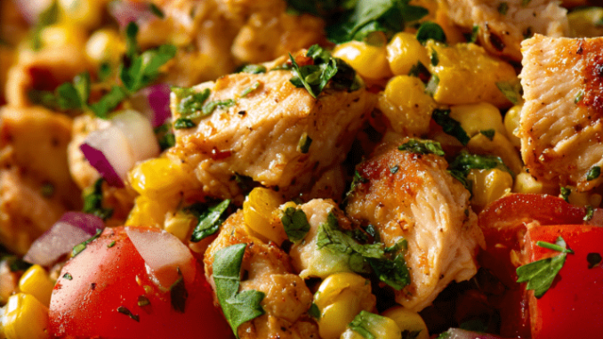 - Divide lettuce between bowls, top with sliced chicken, corn mix, tomatoes, onion, and bell pepper.